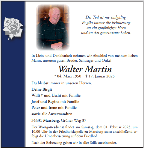 Sprechen Sie im Kondolenzbuch den Hinterbliebenen Ihr Mitgefühl aus und teilen Sie Ihre Erinnerungen und Gedanken mit anderen.